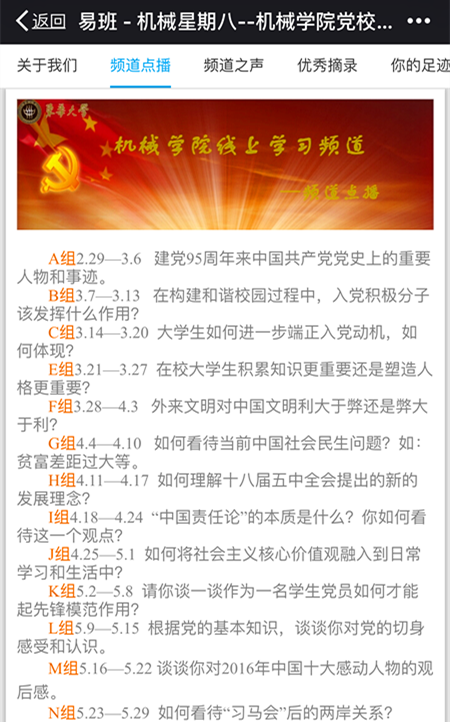 为了增强广大入党积极分子和发展对象的政治意识、大局意识、核心意识和看齐意识,促进“两学一做”落实,从而提升党性修养和思想觉悟,机械学院党校自2016年2月以来,在学院入党积极分子培训班和发展对象培训班中积极开展“易班”线上话题讨论交流活动,利用校园自媒体平台“易班”轻应用,开辟“机械星期八”线上学习频道,鼓励学员们踊跃发言讨论,加深对党的理论知识的认识和见解。