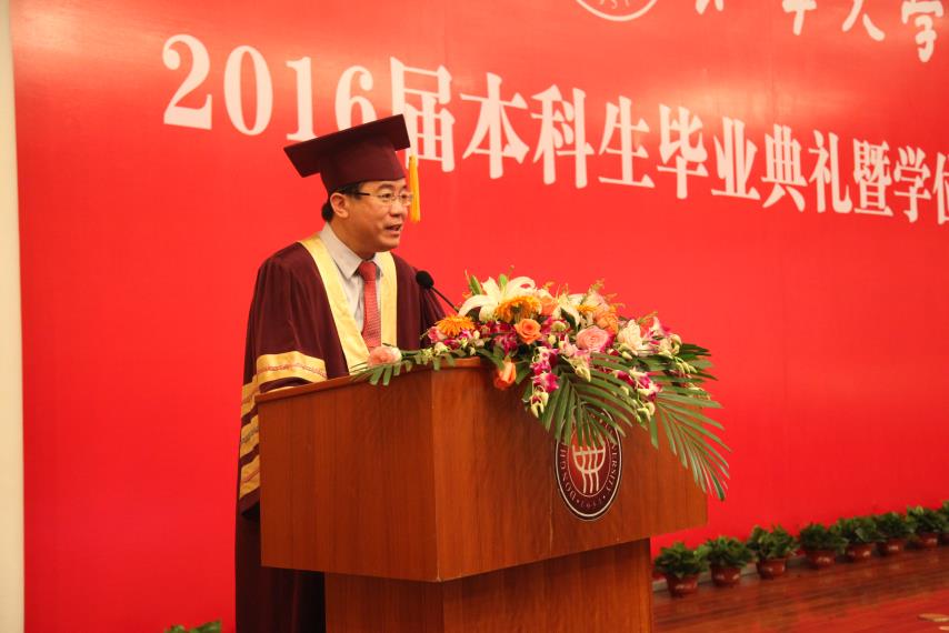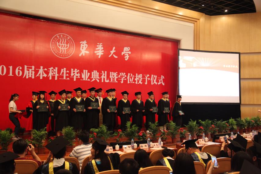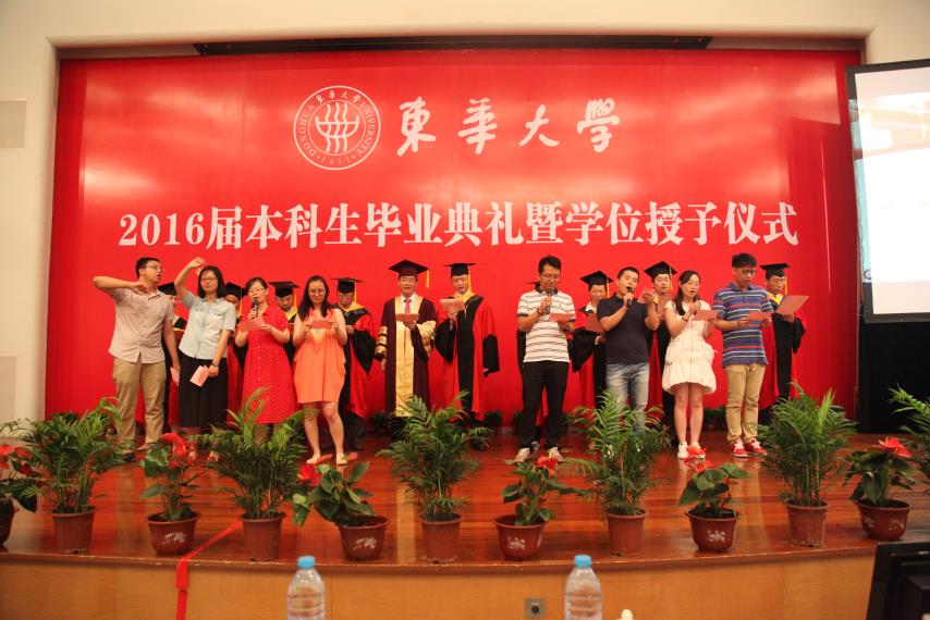 毕业典礼在庄严的国歌声中拉开序幕,校党委书记朱民代表学校党政向全体毕业生表示祝贺,并赞扬了12级毕业生在科创等方面取得的成绩,勉励毕业生抓住机遇,成为创客时代的弄潮儿,发挥自己的最大潜能,充实而美好的生活。典礼上,鲍劲松老师作为导师代表发言。鲍老师用饱含深情的话语,勉励毕业生 “学为好人、持续学习”,并鼓励大家在面对人生选择时,不要害怕选择看起来最难走的路,“你的人生大敌就是堕入平庸”。工设1201于雪琪父亲于涛先生作为家长代表发言,他表达了对老师们的衷心感谢和崇高敬意,并祝福学院培养出更多栋梁之才。毕业生代表卓越机械1201鲍振强,作为一名从部队光荣退伍并获得直研机会保送至火箭军工程大学继续攻读硕士学位的优秀学生,他用一首《别东华》的诗作“冬去春来已数载,回眸东华,忆往夕,思往事,离别不悲。美哉我东华学子,定不负东华!东华往事随风去,比及离别,情之深,意之浓,相聚有时。壮哉我机械英才,必成国之栋梁!” 感恩母校对自己的培养。在校生代表工设1303班徐少东,表达了学长学姐们的美好祝福和对未来的希冀,“昨天你们用壮志书写蓝图,今日我们用豪情诵读华章。今天过后,我们就成了你们。你们用博识多礼磨去了我们的稚气肤浅,你们用志存高远坚定了我们的自信勇气。因为你们的援助引领,我们步步成长;因为你们的赞许鼓励,我们逐梦前行。你们为东华、为机械写下的荣耀,将由我们继续谱写”。