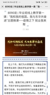 毕业班辅导员王晓晖老师积极利用易班平台发布“疫情之下,毕业班同学在行动”、“疫情之下,如何进行考验复试”、“疫情之下,就业我来帮”、“疫情当前,线上招聘面试需要注意哪些问题”等系列空中主题班会,在毕业班学生中引起热烈反响,累计观看达1500人次。