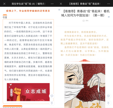 学院密切关注学生的思想和心理状态,加强疫情期间学生的网络思政教育和爱国主义教育。以易班网络思政平台为主阵地,面向师生等不同群体开设“我在学生战‘线堡垒春战‘疫’易起来”专栏,通过辅导员的日记、空中系列主题班会、抗“疫”文艺作品等形式,讲好疫情防控中的中国故事,利用这一场没有硝烟的“全员战争”,借助社会这个“大课堂”、人民群众这位“好老师”,上好一堂生动而难忘的爱国主义“思政大课”。