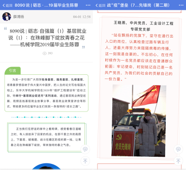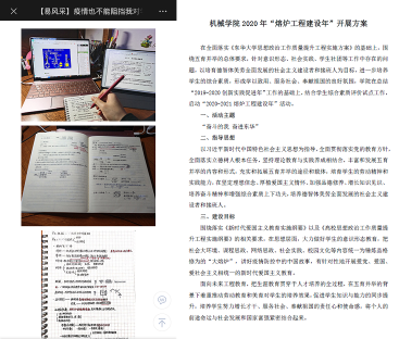 学院认真落实停课不停学、停课不停教”的要求,带领学生在线学习,帮助学生答疑解惑,促进学生在战“疫”中思想、学业同进步。开展《战“疫”同心,致学同行——如何做好线上学习不掉队》和《疫情之下,就业我来帮》等微课,为非毕业班同学指导线上学习要点,为毕业班同学春季校园招聘提供助力。组建师生咨询群、了解学生对在线教学的感受和评价、开展优秀学生笔记征集等,让机械师生携手“云端”,共同上好在线教学课程。