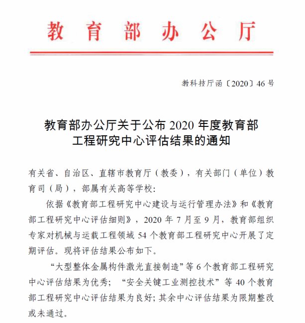 根据教科技厅函[2020]46号文,2020年度“机械与运载工程领域”54个教育部工程研究中心的评估结果是:6个优秀(序号1~6),40个良好(序号7~46),其余为限期整改或未通过。本次评估,教育部科技司依据《教育部工程研究中心建设与运行管理办法》和《教育部工程研究中心评估细则》,组织专家对54个教育部工程研究中心分5组(序号3,12等为第2组)分别进行为期3个月评估,历经自评材料提交与(网上)初评答辩、现场考察和综合评议三阶段。
