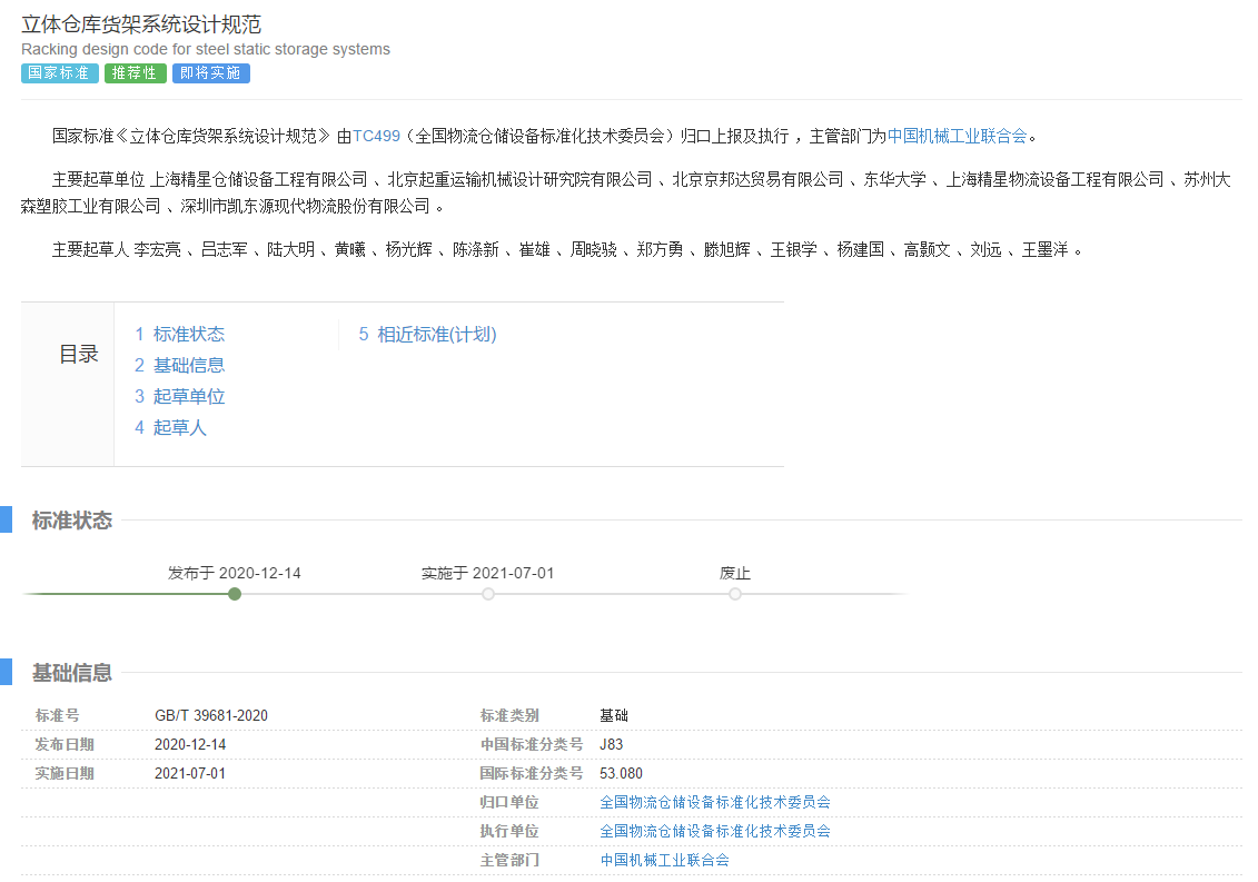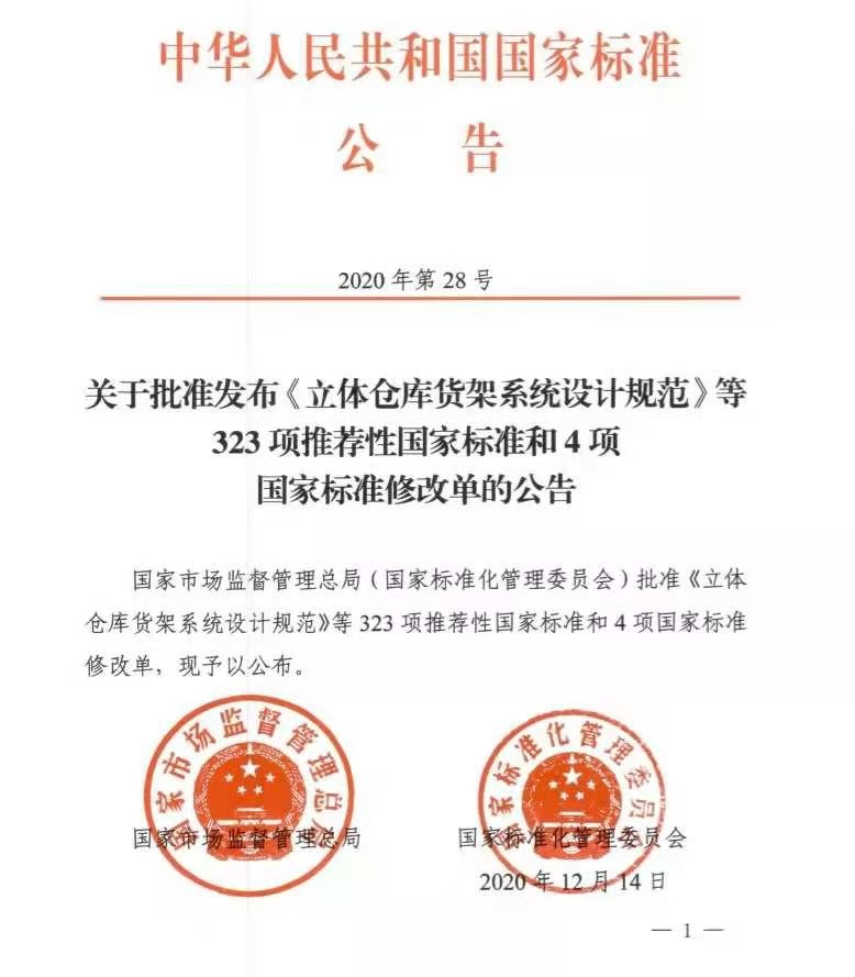 喜讯:beat365官网参与的《立体仓库货架系统设计规范》国家标准GB/T39681-2020正式获批发布