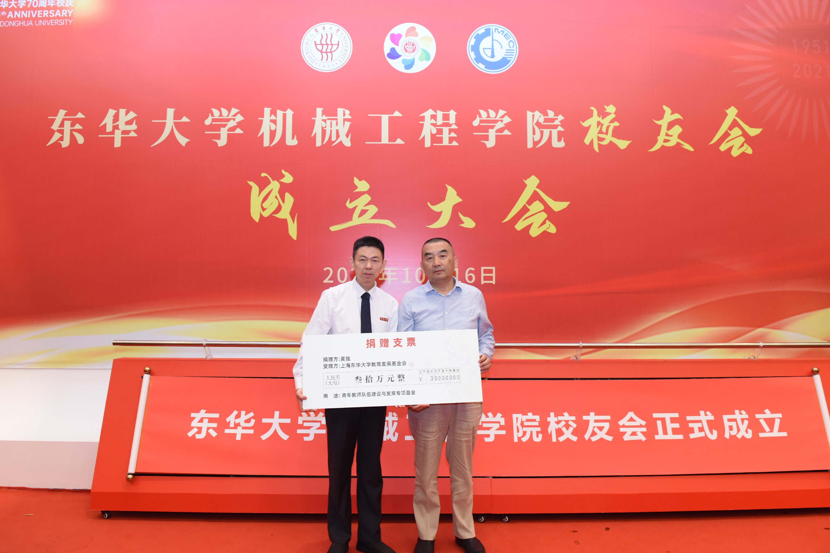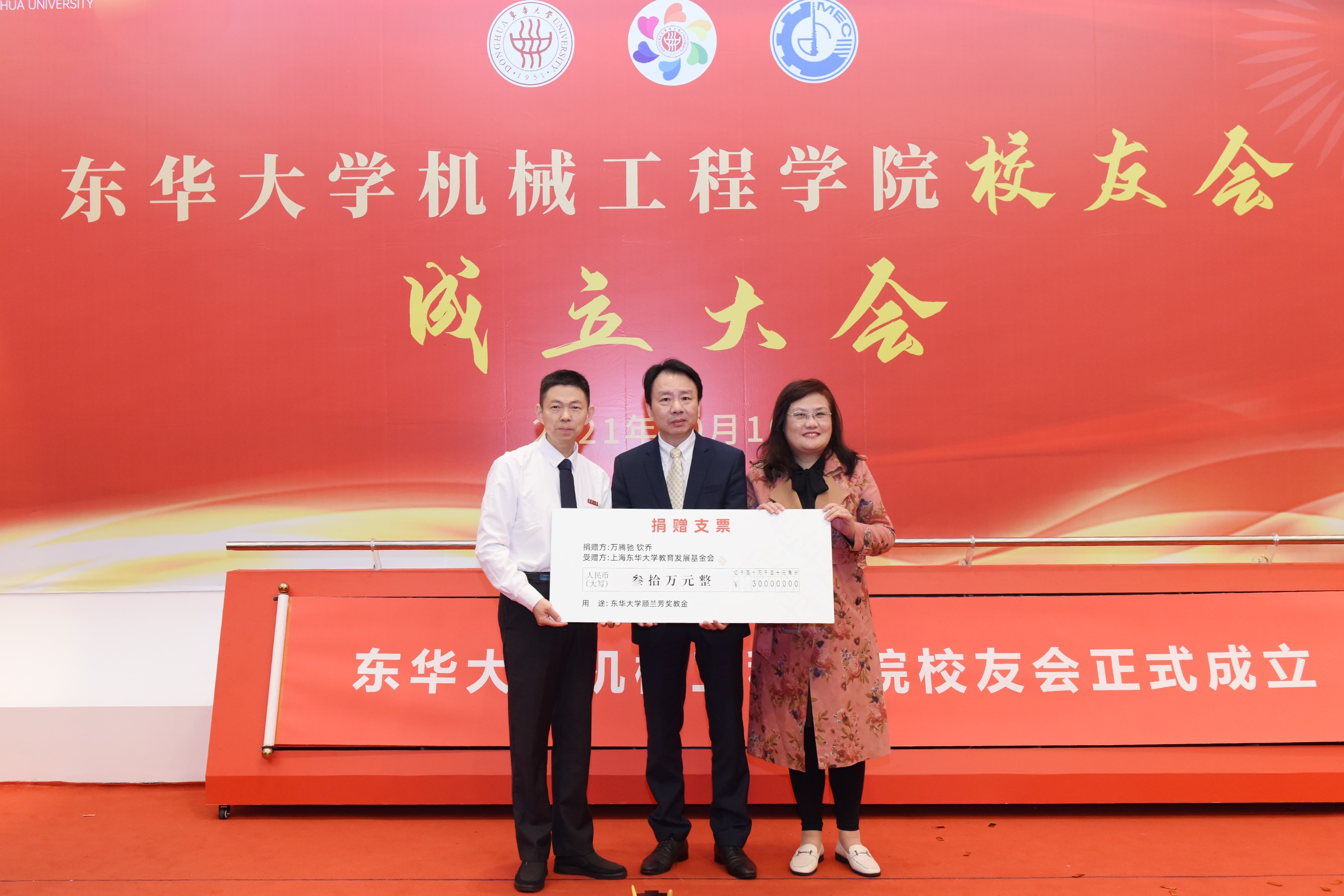 秦皇岛天业通联重工科技有限公司总经理杨超代表公司向学院捐赠100万用于学院发展专项基金;深圳市驰通达集团董事长万腾驰、钦乔夫妇捐款30万,设定“顾兰芳奖教金”用于学院师资队伍建设;南通全技纺织涂层有限公司董事长吴强捐赠30万,支持学院发展和青年教师队伍建设。