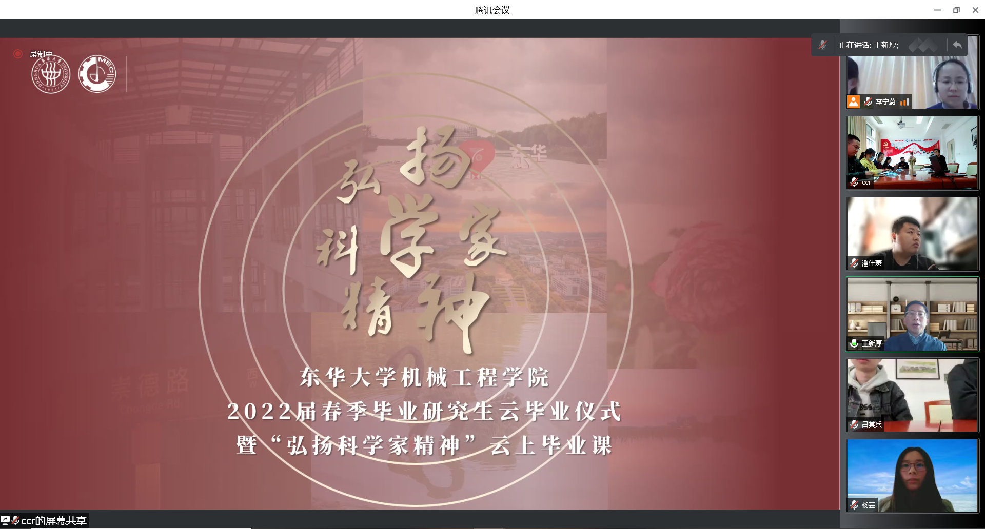 云毕业仪式在《做一颗闪耀的“螺丝钉”》云上毕业课中拉开序幕,安晴晴、宋文博等研究生毕业班辅导员和江亚南、崔旭浩等毕业生代表从科学技术发展“雄关漫道真如铁”的昨天、“人间正道是沧桑”的今天、“长风破浪会有时”的明天,勉励全体毕业生弘扬科学家精神,传承“求真务实、 创新创造、团结进取”的机械奋斗品格,做一颗闪亮的“螺丝钉”,担负起“请党放心、强国有我”的历史重任。