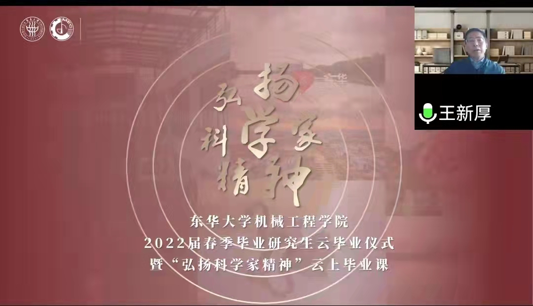学院党委书记王新厚为毕业生们讲授了“弘扬科学家精神”毕业最后一课。他强调,做新时代的奋斗者,坚定信念是前提,善于学习是路径,勇于创新是关键,奋斗的方向应是永不停歇的“登高望远”。一是终身之学习,要多一些“精阅读”、多一些“深思考”,不断触类旁通、举一反三,获得破瓶颈的启迪,找到解难题的钥匙,成为某个领域的行家里手;二是创新之精神,要把东华求学之旅中学会的超越所学、思辨质疑的可贵品质,运用到今后的工作生活中去,在创新突破上持续下功夫,勇于啃“硬骨头”,在更多领域取得新的突破,为国家发展、社会进步作出东华机械人应有的贡献;三是实干之担当,要传承黄宝妹、郝建秀、李培根等一代代优秀校友身上的东华精神,努力践行“崇德博学、砺志尚实”的校训精神,在各行各业干出东华机械人的新气象、好成绩。希望毕业生带着东华机械人的责任与烙印,在忘我奋斗中建功伟大国家、建树伟大梦想。