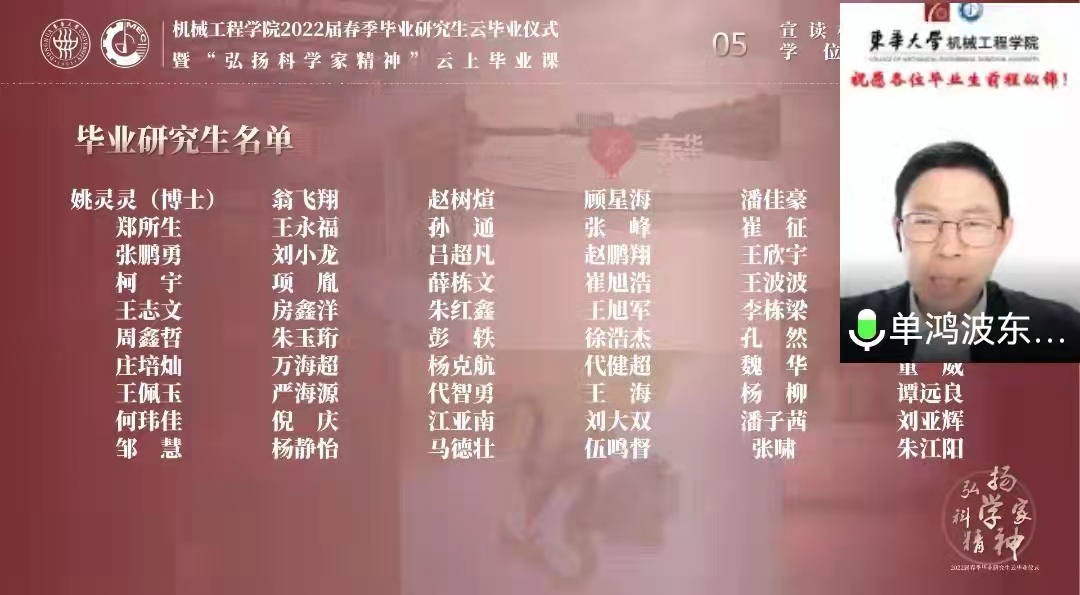 3月28日,beat365英国官网2022届春季毕业研究生云毕业仪式在云端举行,师生同上“弘扬科学家精神”云上毕业课。学院党委书记王新厚、院长单鸿波等全体党政班子成员、导师代表、辅导员、春季毕业研究生以及部分家长代表等100余人相聚云端,一同分享了这一喜悦时刻,仪式由学院党委副书记李宁蔚主持。