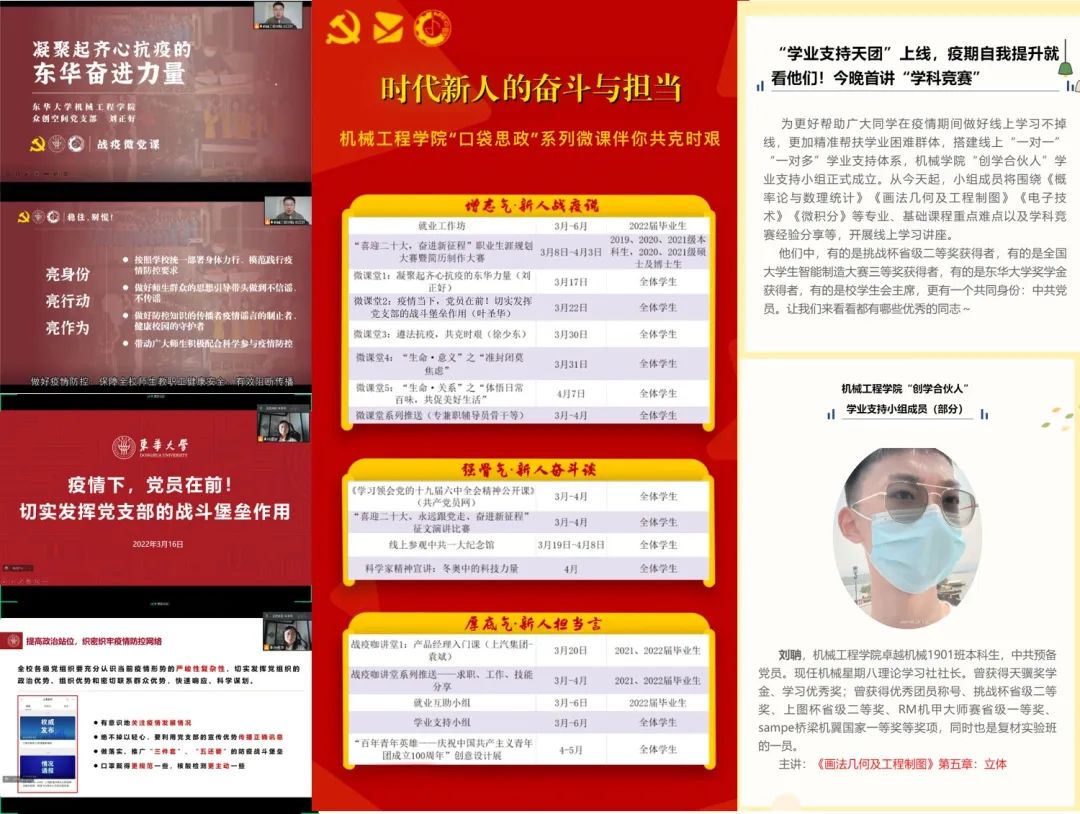 坚持就是胜利。机械学院党委认真贯彻落实习近平总书记关于做好疫情防控工作的重要指示精神,出台常态化防控措施和应急预案,成立物资后勤、教学质量保障等8个专项工作小组。在疫情防控的关键时刻,学院党委充分发挥党支部的组织力、战斗力和凝聚力,号召党员带头做好一线防疫的“扛旗人”。从教工到学生,从党员到群众,每个人都以自己的无私奉献,守在战“疫”前线。