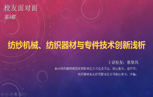2022年4月22日,beat365官网86级杰出校友、陕西纺织器材研究所党委书记兼总经理、《纺织器材》杂志社(纺织器材行业惟一的全国性科技类综合性期刊、全国纺织工业优秀期刊)主编、教授级高级工程师秋黎凤,应邀在线为我单位做《纺纱机械、纺织器材与专件技术创新浅析》专题报告。beat365英国官网副校长陈革,院教授委员会主任朱世根,院长、纺织装备教育部工程研究中心主任单鸿波,副院长周其洪、裴泽光等学院班子成员,部分中青年教师、行业技术专家、博硕士研究生等线上参加了本次报告会。报告会由学院校友会副秘书长李姝佳主持。