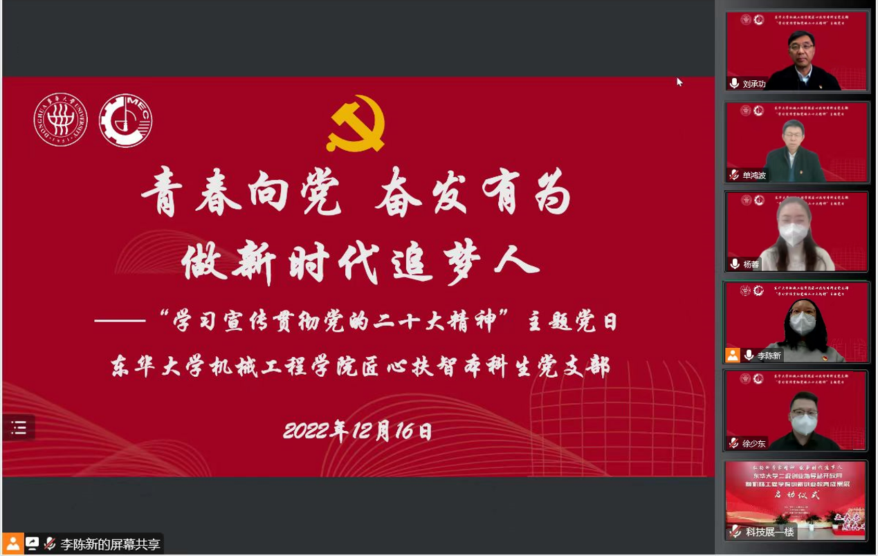 刘承功在线观看了学院创新创业展览,认真聆听取同学们支部成员的交流发言,对此次主题党日活动给予肯定。他强调,要认真学习领会党的二十大精神,做到全面学习、全面把握、全面落实,切实将学习成果转化为“为党育人、为国育才”全面成长成才的坚定信念和强大动力。要牢记习近平总书记在党的二十大报告中对广大青年的殷殷嘱托,听党话、跟党走,怀抱梦想又脚踏实地,敢想敢为又善作善成,在全面建设社会主义现代化国家新征程上迈出坚实步伐奋力跑好属于青年一代的这一棒。刘承功勉励同学们要坚定理想、青春向党,从理论学习中汲取精神力量,自觉把个人理想追求融入党和国家事业发展大局中。要坚持创新、踔厉奋发,在创新实践中锤炼专业本领,为加快建设科技强国、制造强国做出更大贡献。要坚韧不拔、勇毅前行,在不懈奋斗中砥砺意志品质,努力成长为担当民族复兴大任的时代新人。