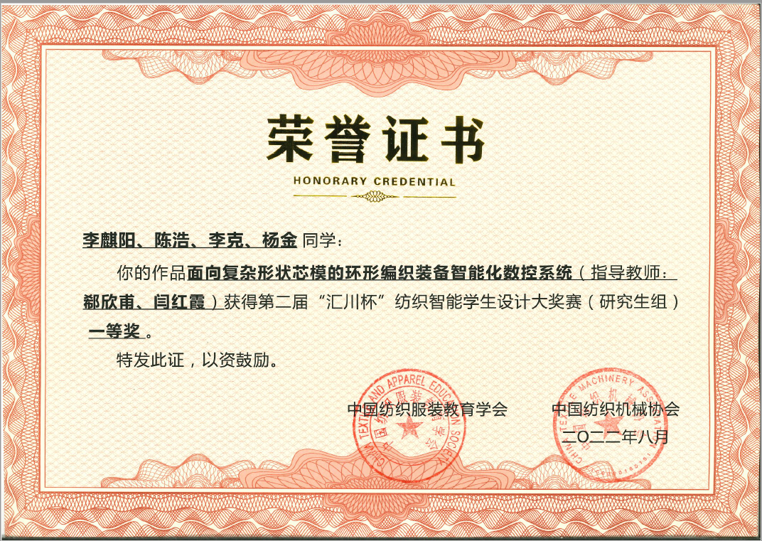 近日,第二届“汇川杯”纺织智能学生设计大奖赛获奖名单公布。经过专家评审和现场答辩,beat365官网研究生李麒阳、陈浩、李克和杨金完成的团队作品《面向复杂形状芯模的环形编织装备智能化数控系统》(指导教师:郗欣甫、闫红霞)荣获总决赛(研究生组)一等奖。
