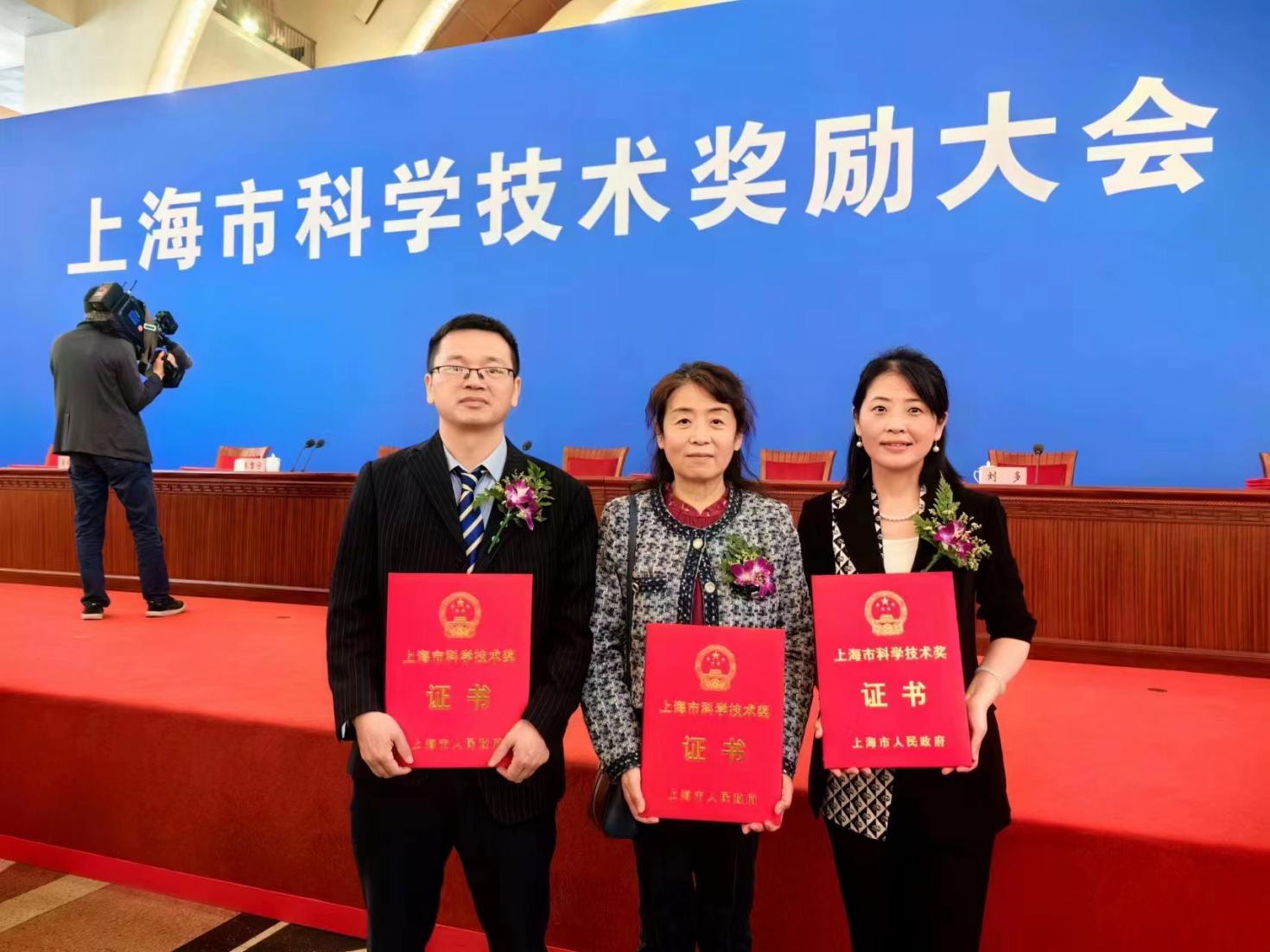 获奖代表在2022年度上海市科学技术奖励大会上合影(左起彭倚天、李蓓智、季霞)