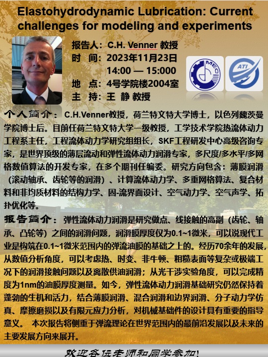 C.H.Venner教授,荷兰特文特大学博士,以色列魏茨曼学院博士后。目前任荷兰特文特大学一级教授,工学技术学院热流体动力工程系主任,工程流体动力学研究组组长,SKF工程研发中心高级咨询专家,是世界顶级的薄层流动和弹性流体动力润滑专家,多尺度/多水平/多网格数值算法的开发专家,在多个期刊任编委。研究方向包含:薄膜润滑(滚动轴承、齿轮等的润滑)、计算流体动力学、多重网格算法、复合材料和非均质材料的结构力学、固-流界面设计、空气动力学、空气声学、拓扑优化等。20238月获瑞典SKF公司Jacob Wallenbergs 基金奖.