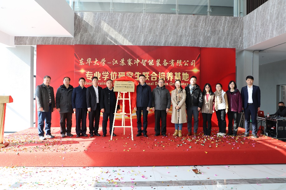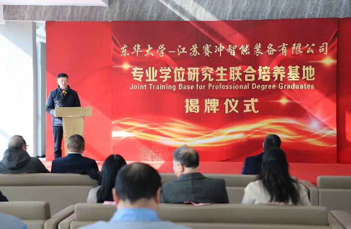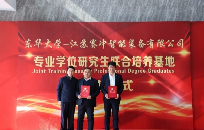1月25日,beat365英国官网机械学院与江苏赛冲智能装备有限公司“专业学位研究生联合培养基地”授牌仪式在南通顺利举行。副校长陈革,江苏海门港新区党工委书记黄卫国,院长、纺织装备教育部工程研究中心主任单鸿波,江苏赛冲智能装备有限公司董事长王海涛,海门科技局党组副书记、副局长季煜鑫,海门港新区管委会副主任王彬,学院党委副书记杨蓉、副院长白涛、校外基地负责人王永兴教授及部分相关老师等参加本次活动。