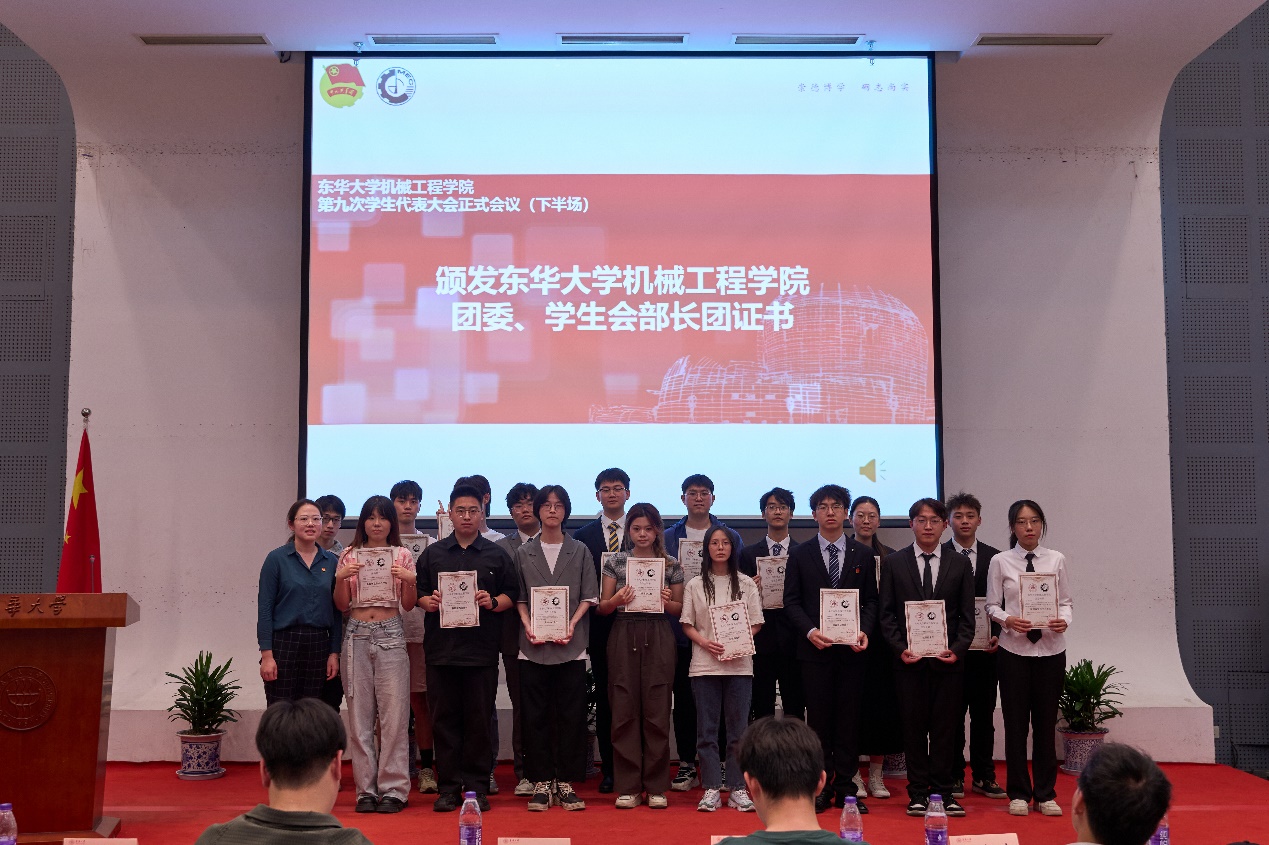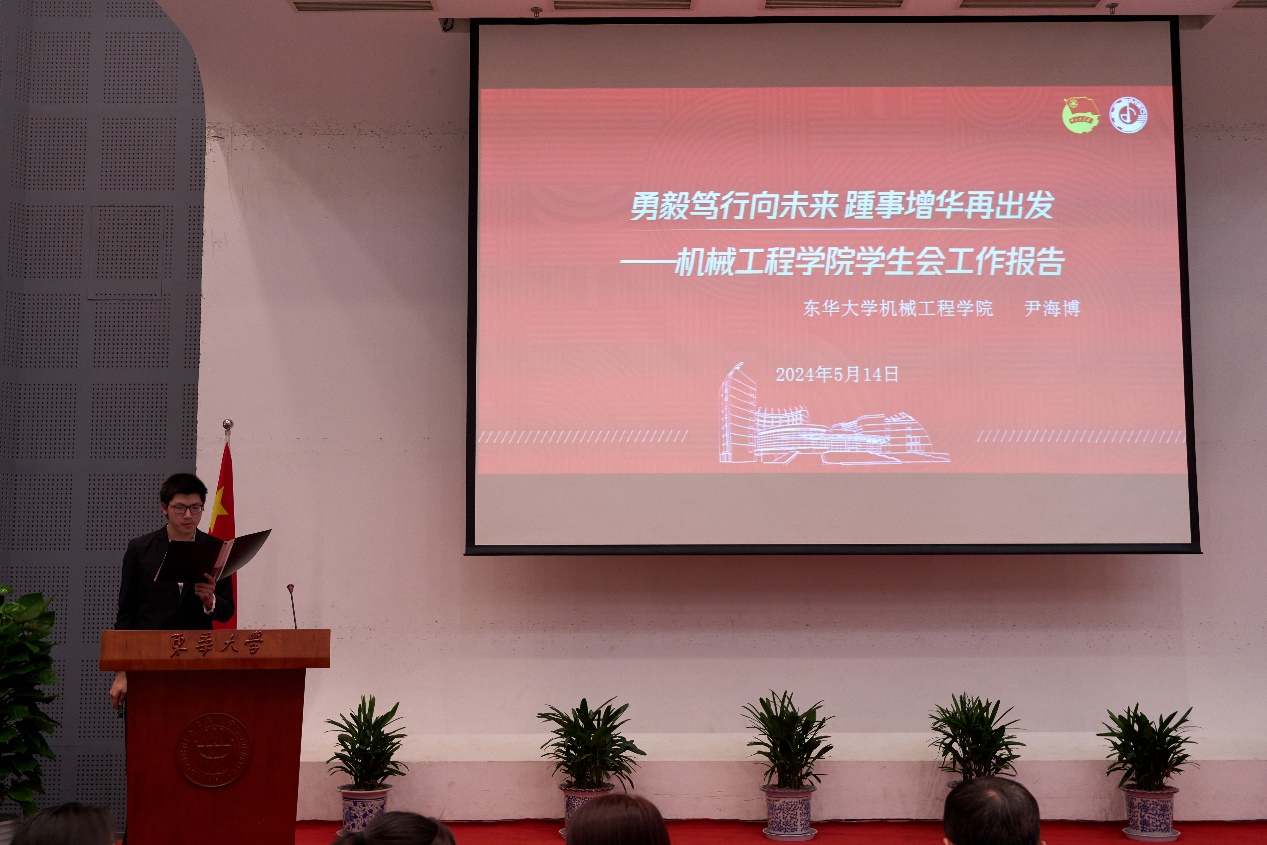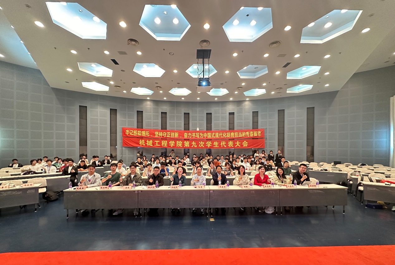 5月14日,beat365英国官网第九次学生代表大会在松江校区图文信息中心第二报告厅举行。beat365英国官网党委书记王新厚、党委副书记杨蓉、学生工作办公室副主任胡敏、团委书记王晓晖、副书记姜雪梅、学院专职辅导员23级年级组长叶圣华、专职辅导员徐少东、校团委学生兼职副书记唐伟、校学生会主席李一鸣、学院兼职辅导员校团委志工部部长张学晖、学院兼职辅导员段健琦、武晓蒸,机械学院全体学生代表、兄弟学院学生会代表与会。会议听取和审议机械学院学生会工作报告,听取和审议学代会提案工作报告,选举产生beat365英国官网第九届学生委员会委员和学生会新一届主席团。