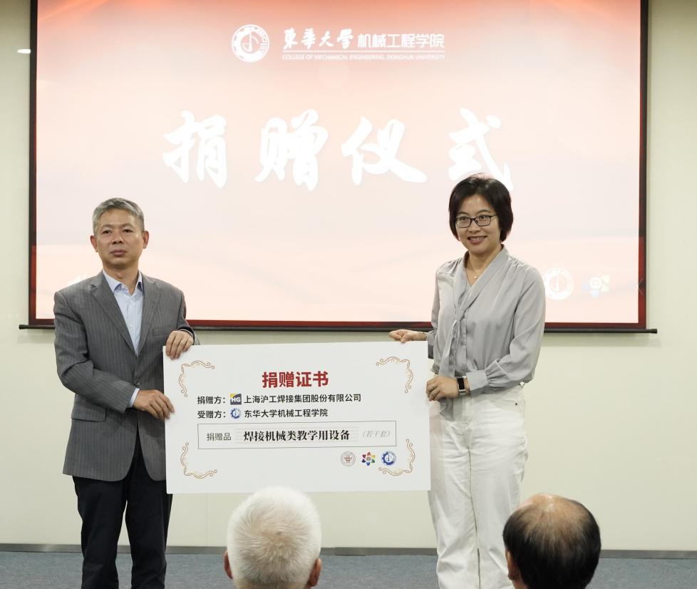 2019年至今,上海沪工焊接集团连续6年捐赠20余万元在学院设立奖学金,用于奖励学院优秀学生。今年沪工集团又为学院捐赠一批焊机类教学设备,机械学院副院长周其洪接受捐赠。