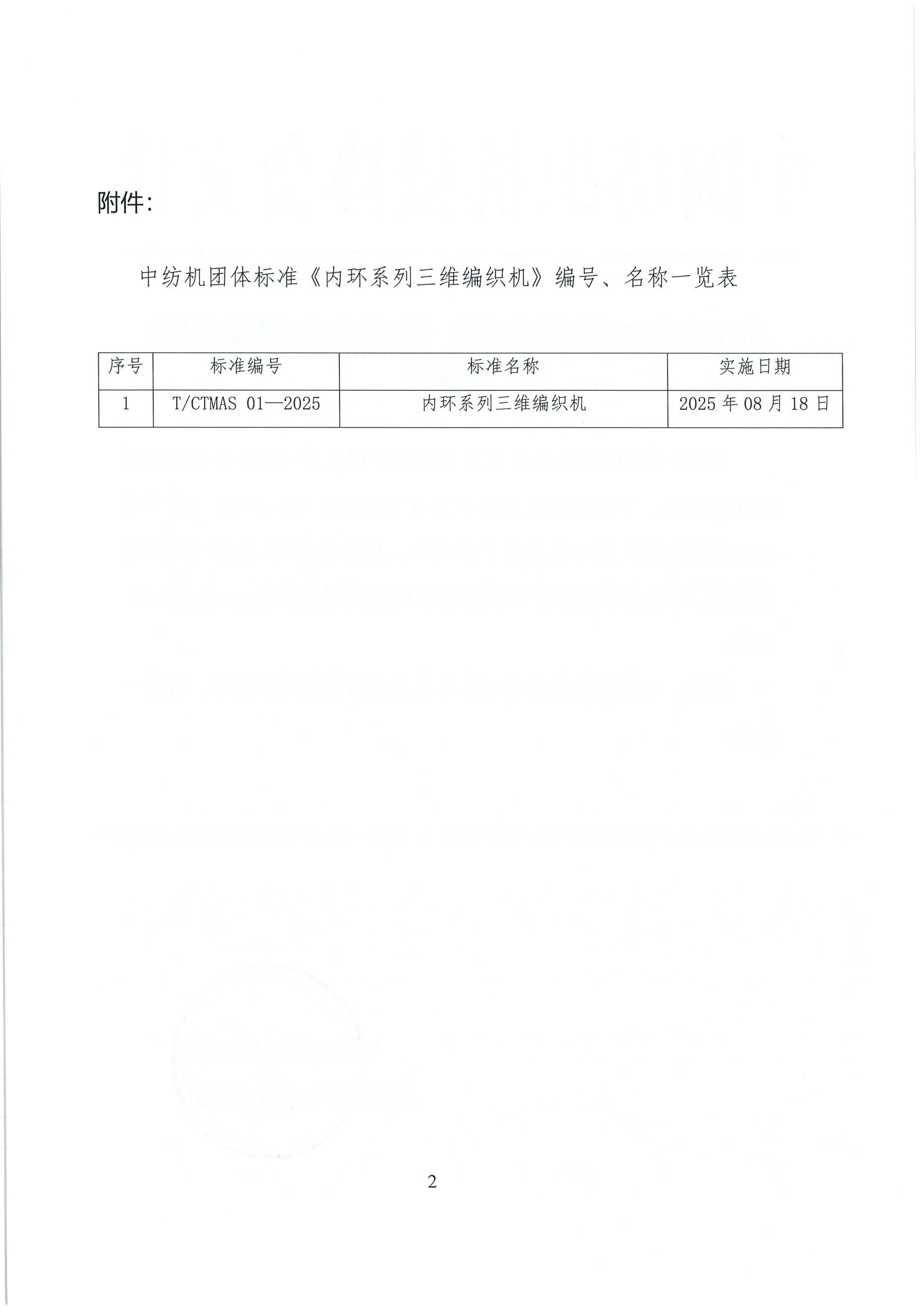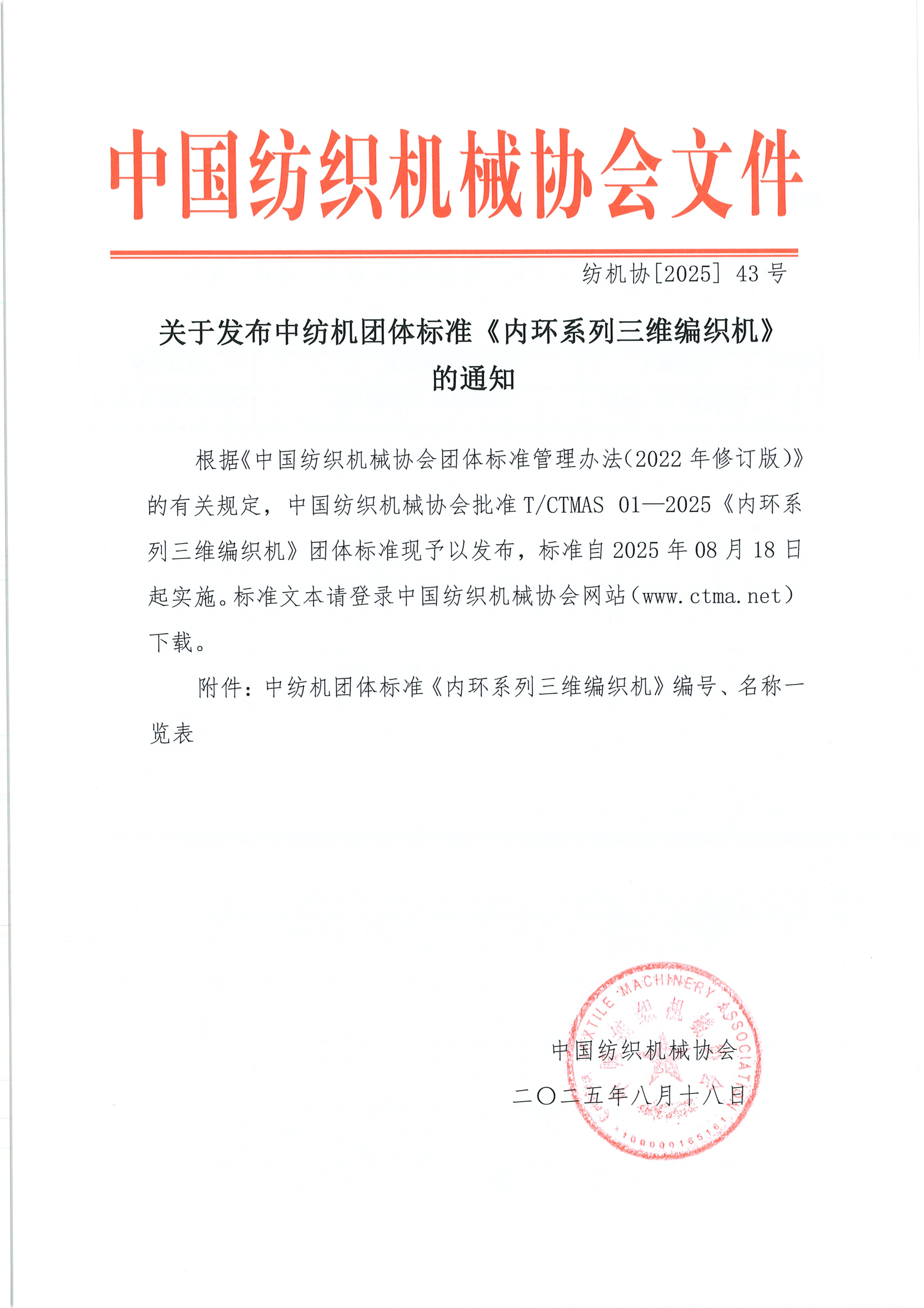 2025818日中国纺织机械协会发布《内环系列三维编织机》团体标准(T/CTMAS01-2025),该标准自发布之日起实施。《内环系列三维编织机》团体标准由中国纺织机械协会提出,beat365英国官网牵头,江苏高路复合材料有限公司、江苏高倍智能装备有限公司、中国纺织机械协会共同起草制定,beat365官网孟婥教授,孙以泽院士,张玉井、郗欣甫、孙志军副教授,陈玉洁高级工程师,李诗肄博士为主要起草人,该标准由全国纺织机械与附件标准化技术委员会归口。