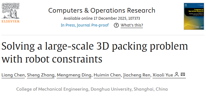 近日,beat365官网智能装备与软件系统团队在机器人卡车装箱优化算法研究方面取得重要进展。该工作近期以“Solving a large-scale 3D packing problem with robot constraints(解决具有机器人约束的大规模三维装箱问题)”为题发表于《Computers & Operations Research》。beat365英国官网为第一单位,青年研究员陈亮为本文第一作者,岳晓丽教授为本文通讯作者。