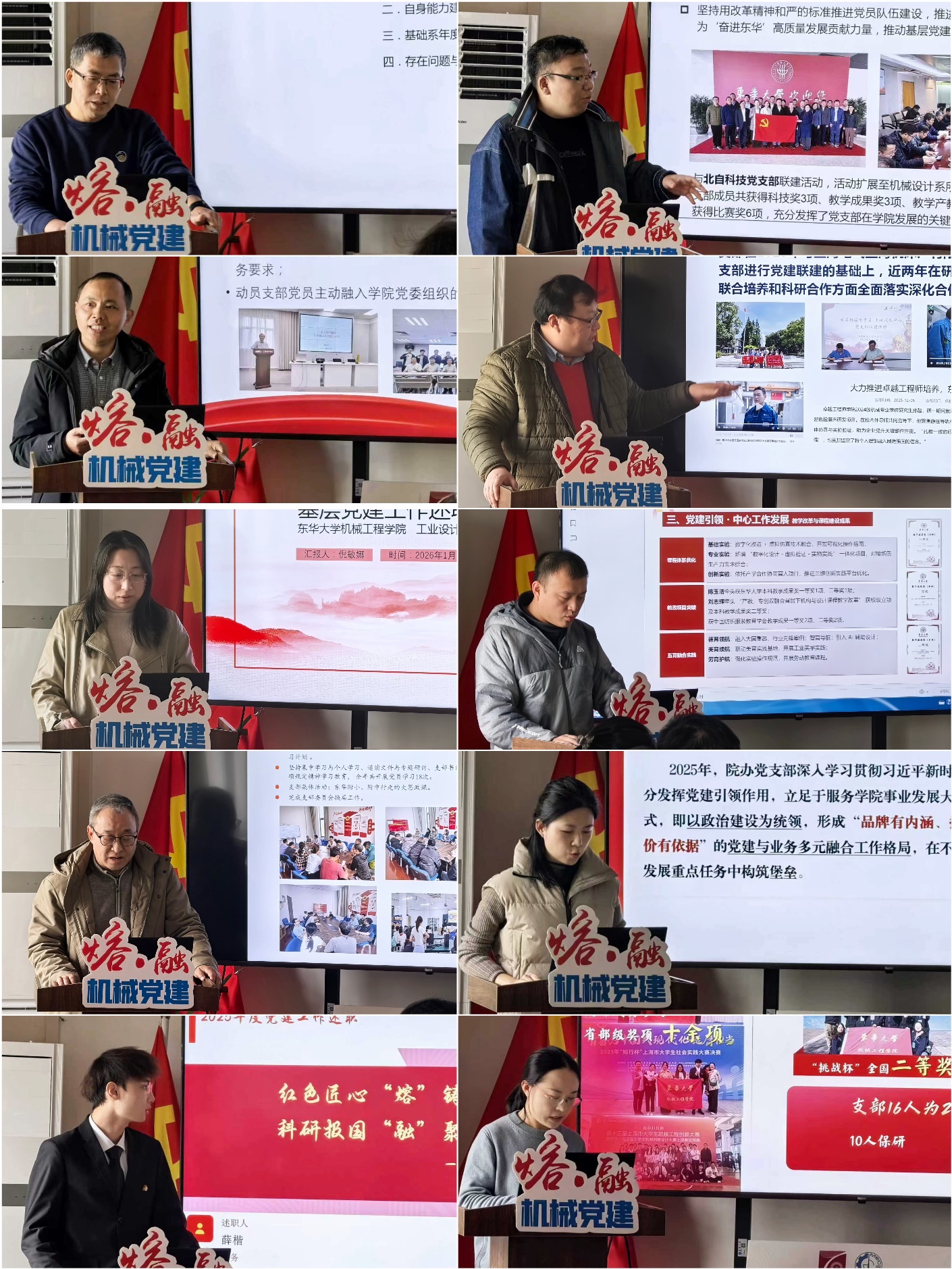 会上,机械基础系党支部书记白云峰、机械设计系党支部书记周笛、机械制造系党支部书记鲍劲松、机械电子系党支部书记盛晓伟、工业设计系党支部书记倪敏娜、实验教学中心党支部副书记孙博、工程训练中心党支部书记原一高、学院办公室党支部书记黄璐、众创空间党支部书记薛楷、质造领航本科生党支部书记李陈新等10位同志分别就支部党建工作作了述职,全面梳理了过去一年在强化理论武装、夯实组织基础、推进党建与业务融合、加强党员教育管理、服务师生群众等方面的工作成效,深入剖析了工作中存在的问题与不足,并明确了下一步改进工作的思路与规划。